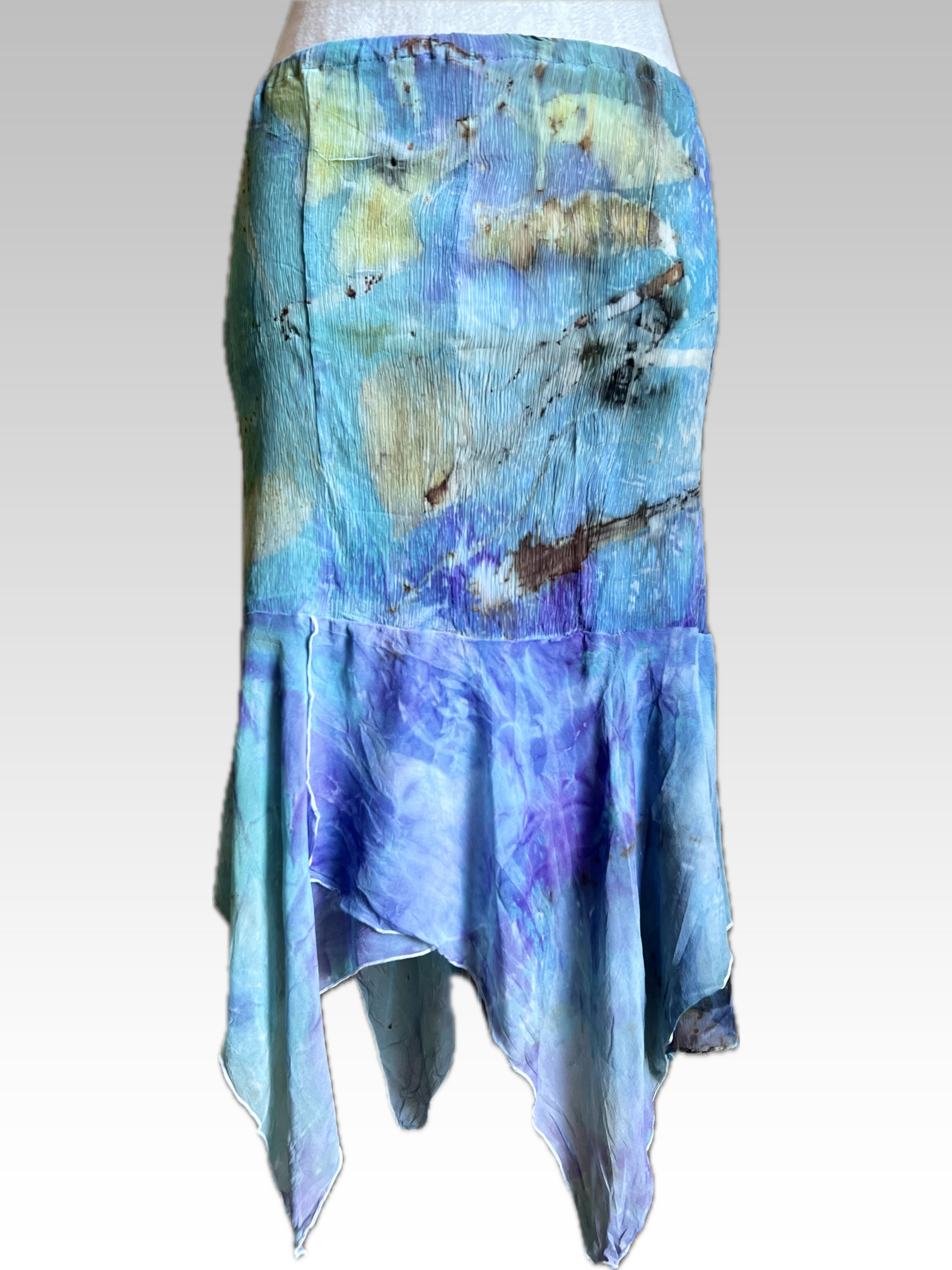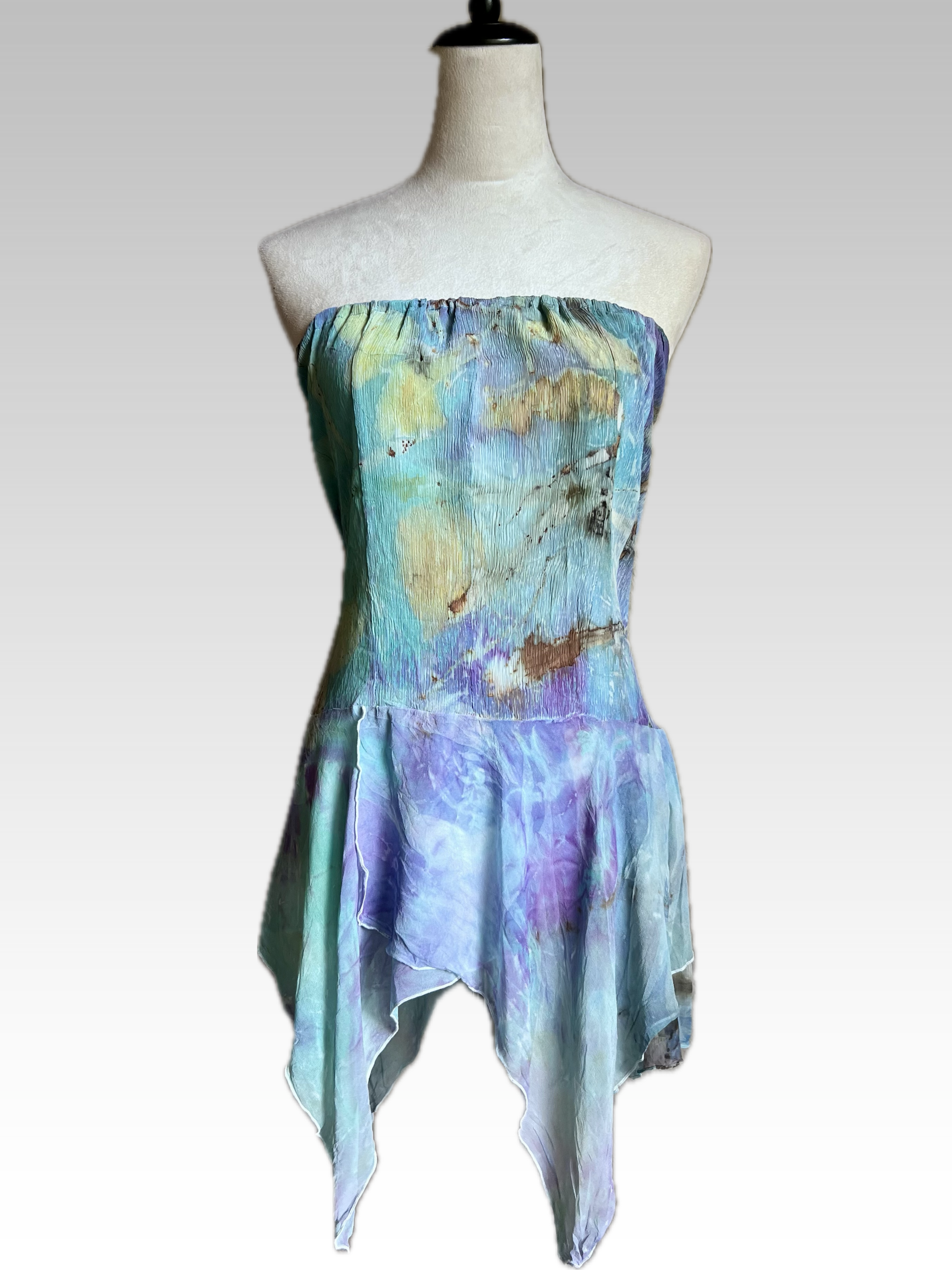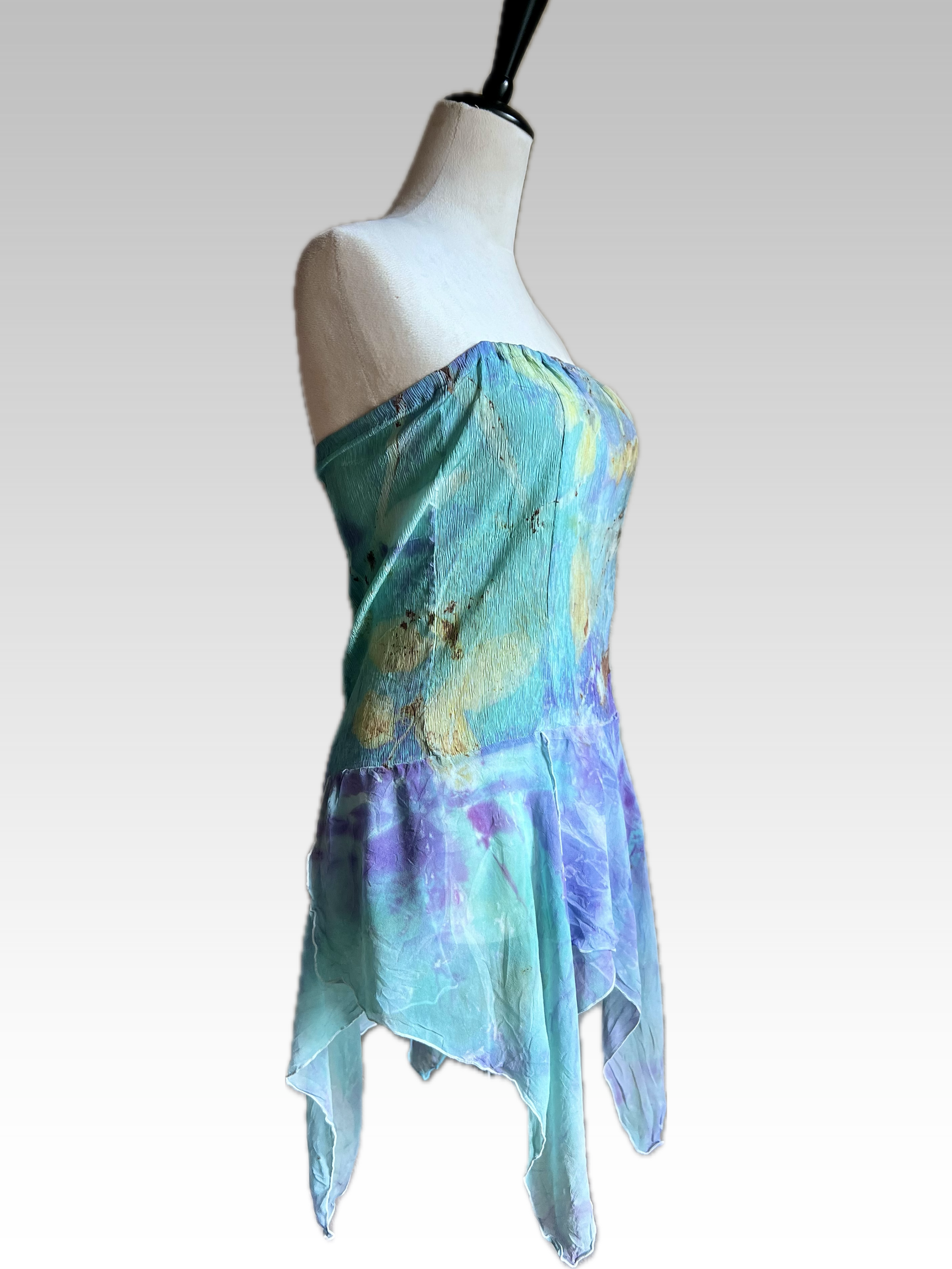 This piece is both hand-dyed in our low-impact dye technique, and botanically printed. Utilizing locally grown and foraged plants, this dress encapsulates the natural colors of a variety of South Florida plants. This process of botanical/eco print eliminates excessive pollution common in the fashion industry. As per all of our hand-dyed pieces, this item is unique and can never be exactly replicated.