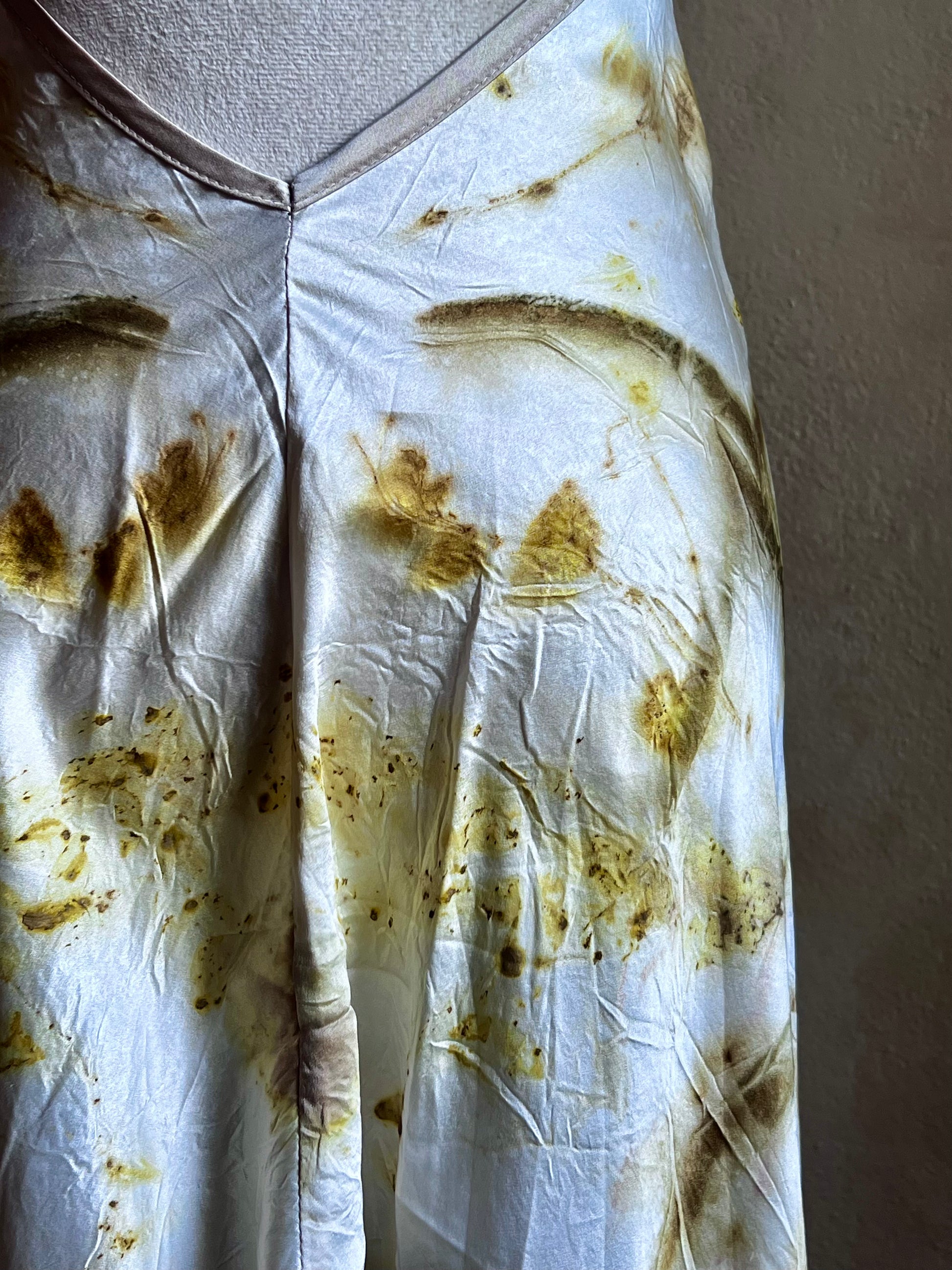 Utilizing locally grown and foreign plant materials, this piece is dyed in botanical/eco print, featuring the varying natural colors of a variety of local South Florida plants. This process of botanical/eco print eliminates excessive pollution common in the fashion industry.  As per all of our hand-dyed pieces, this item is unique and can never be replicated.