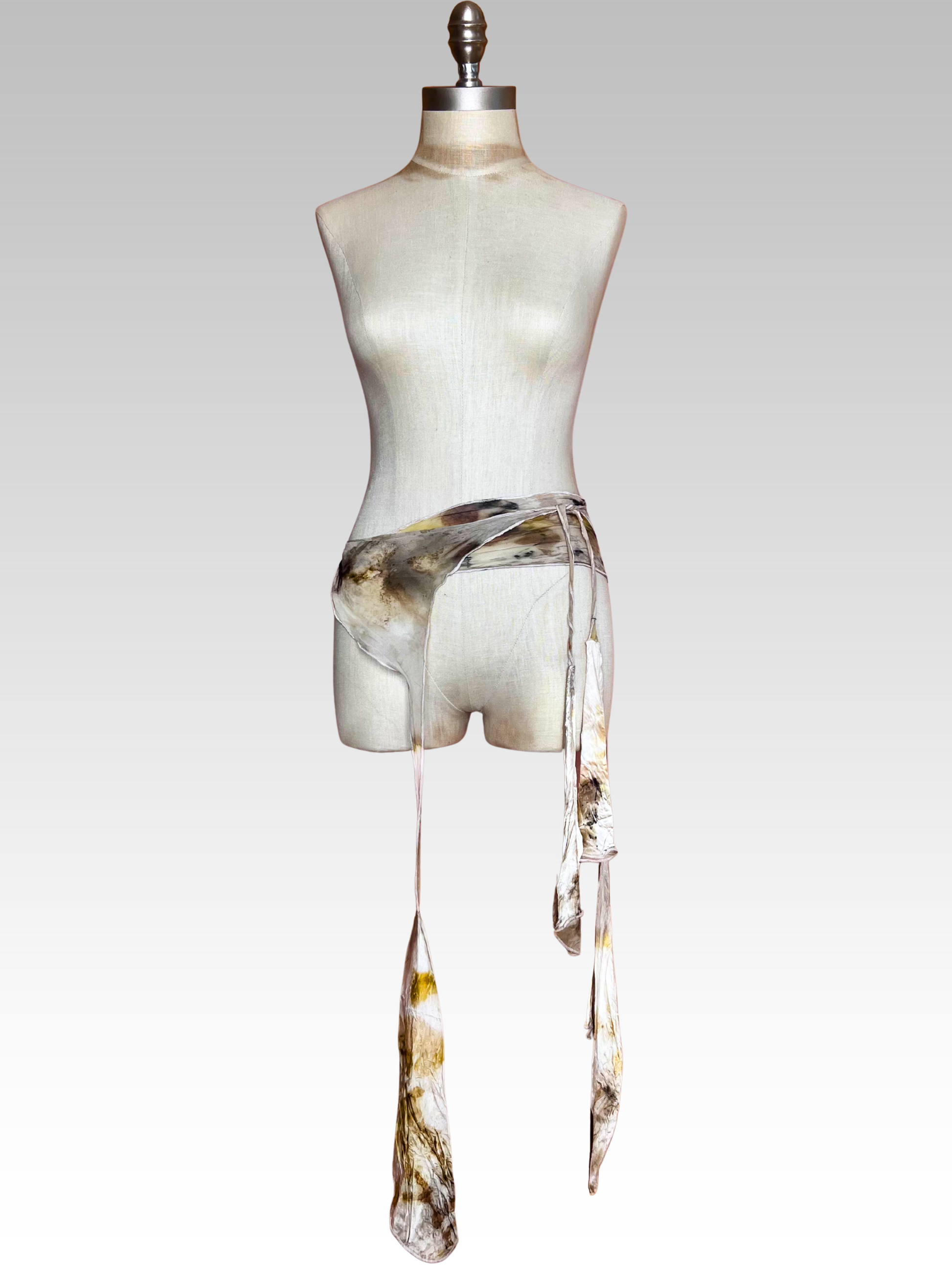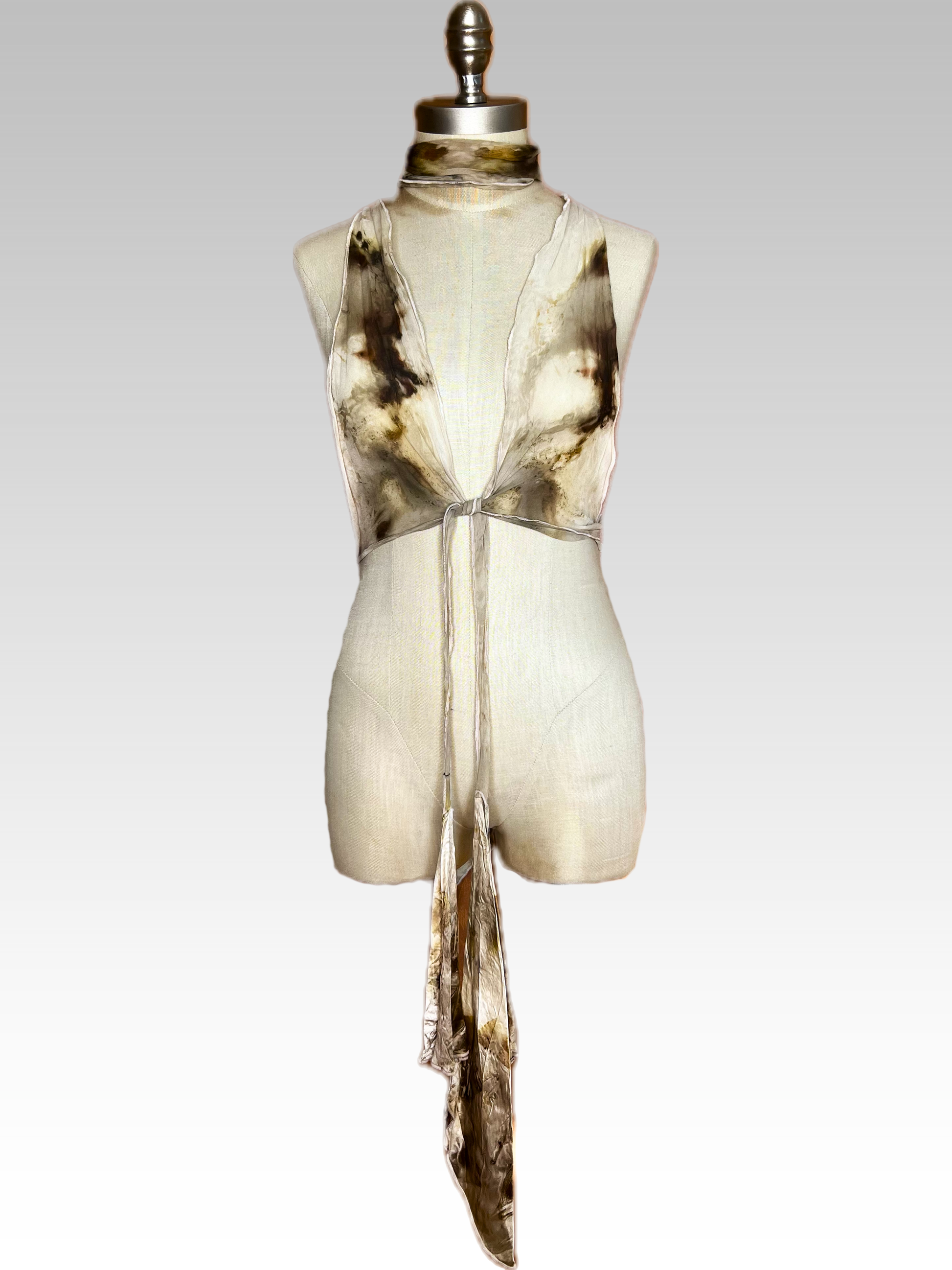 Utilizing local plants, this piece is saturated in botanical/eco print, featuring the natural colors of a variety of South Florida plants. This process of botanical/eco print eliminates excessive pollution common in the fashion industry. As per all of our hand-dyed pieces, this item is unique and can never be exactly replicated.