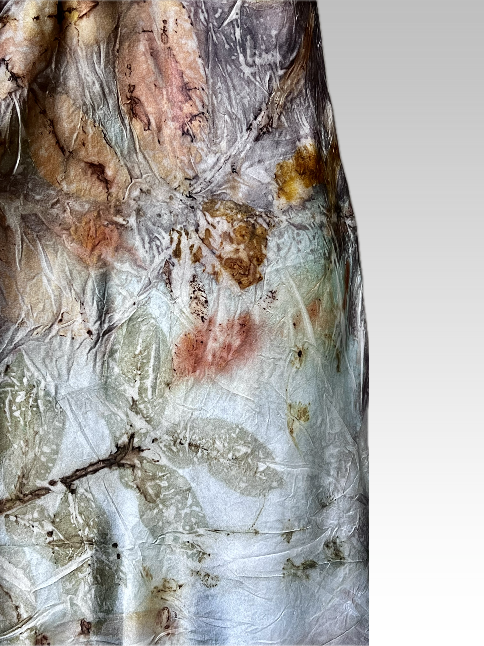 This piece is both hand-dyed in our low-impact dye technique, and botanically printed. Utilizing locally grown and foraged plants, this dress encapsulates the natural colors of a variety of South Florida plants. This process of botanical/eco print eliminates excessive pollution common in the fashion industry. As per all of our hand-dyed pieces, this item is unique and can never be exactly replicated.