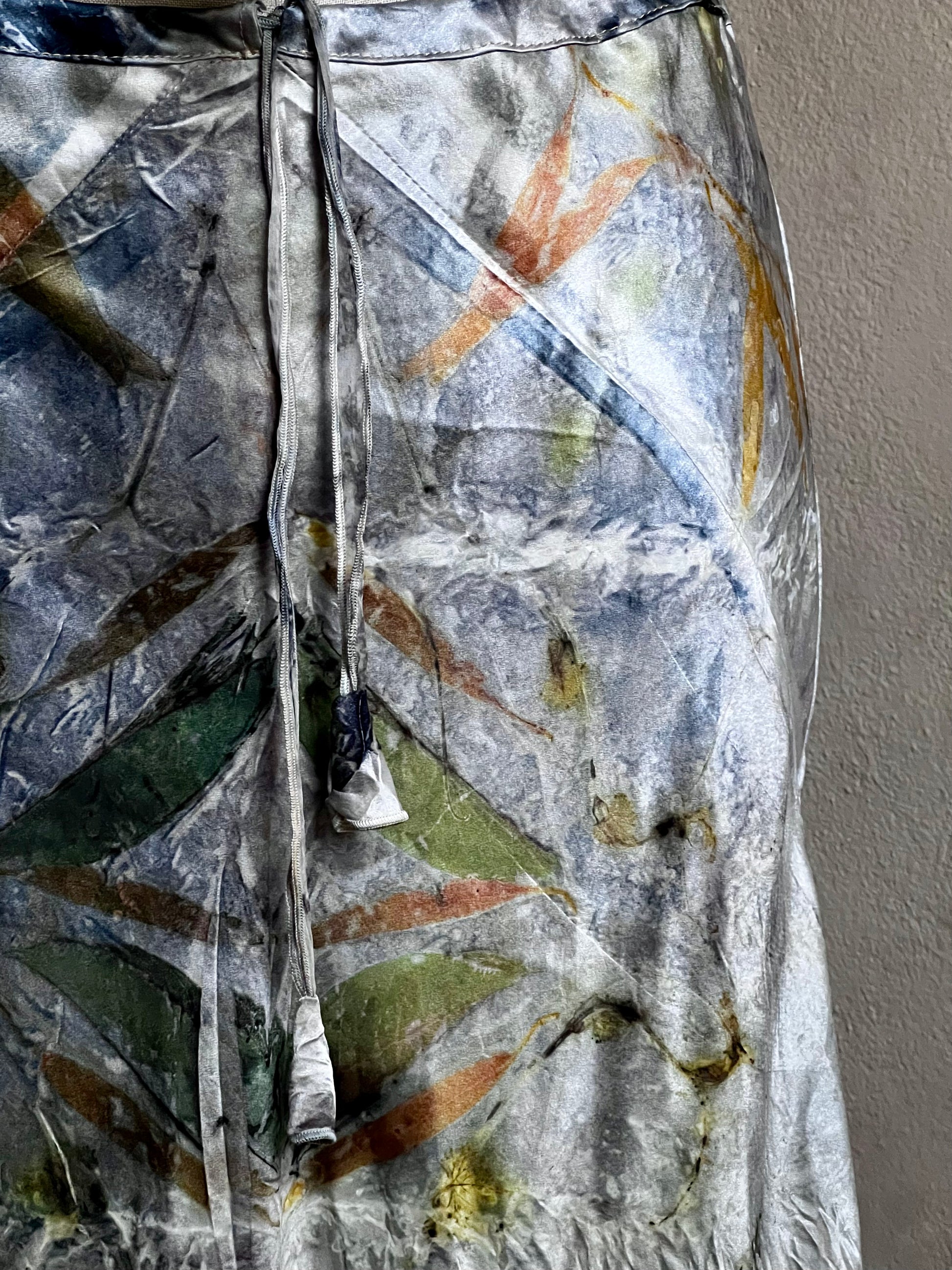 Utilizing locally grown and foreign plant materials, this piece is botanically/eco printed, featuring the varying natural colors of a variety of local South Florida plants. This process of botanical/eco print eliminates excessive pollution common in the fashion industry. As per all of our hand-dyed pieces, this item is unique and can never be replicated.